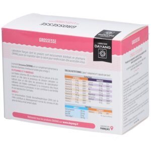 Le produit Grossesse 3 mois DAYANG est un complément alimentaire à base de vitamines, minéraux et acides gras oméga-3.Les folates (vitamine B9), la vitamine B12, le calcium et le zinc jouent un rôle dans le processus de division cellulaire. Le calcium joue un rôle dans les processus de spécialisation cellulaire.