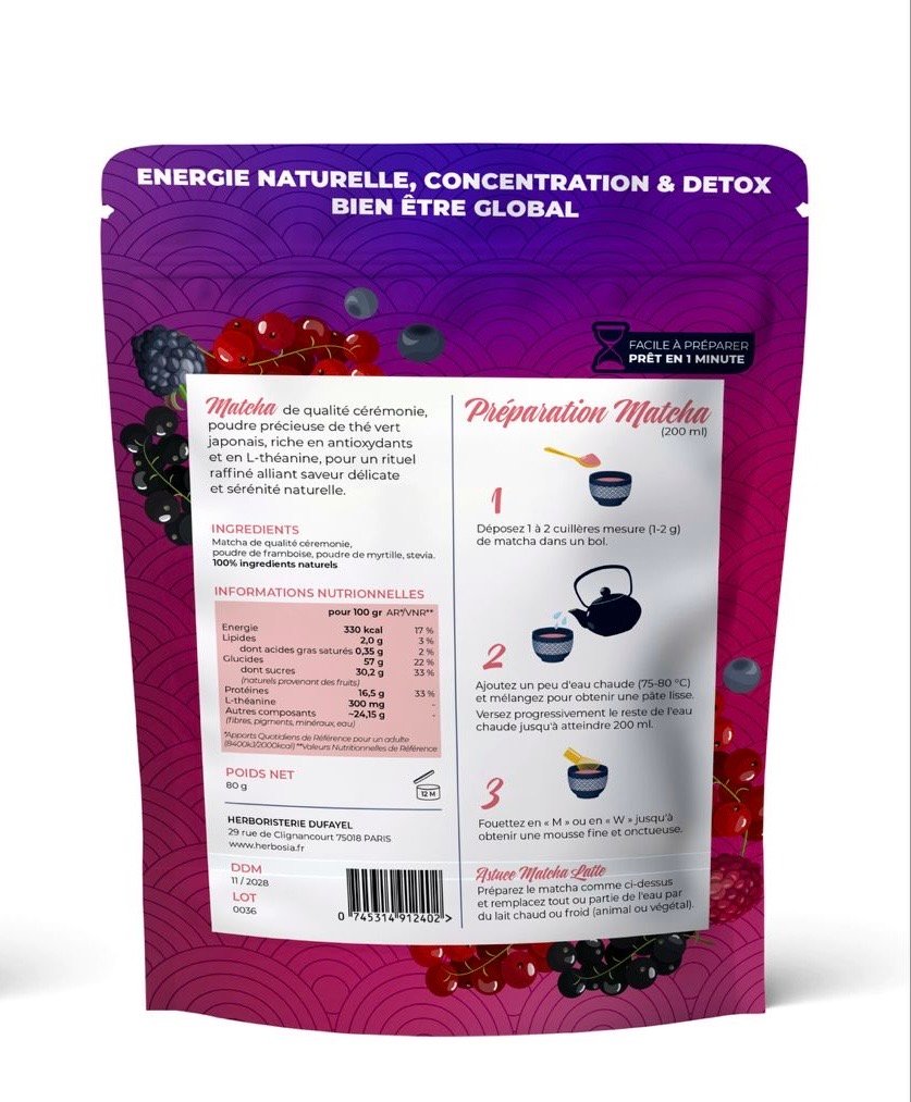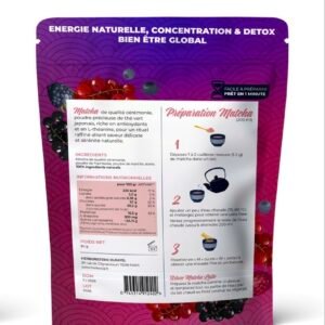 Préparé à partir de thé vert cérémonial japonais, il est sublimé par une alliance naturelle de poudre de framboise, de poudre de myrtille et d’une touche de stévia végétale, pour une saveur délicatement sucrée, sans additifs ni arômes artificiels. 🍃